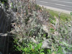 On a recent stroll down a pathway in my neighbourhood, I was startled with an unexpected – and, for me, completely unfamiliar – sight: the incredibly ambitious nests of Archips cerasivorana (uglynest caterpillars). An elaborate network of silk netting covered every single branch of the critters’ leafy hotels and spread from plant to plant in dense cobwebs, like Hallowe’en decorations set out at the wrong time. Completely sheltered in their cosy nests, the caterpillars were settled down to a grand old feast.
