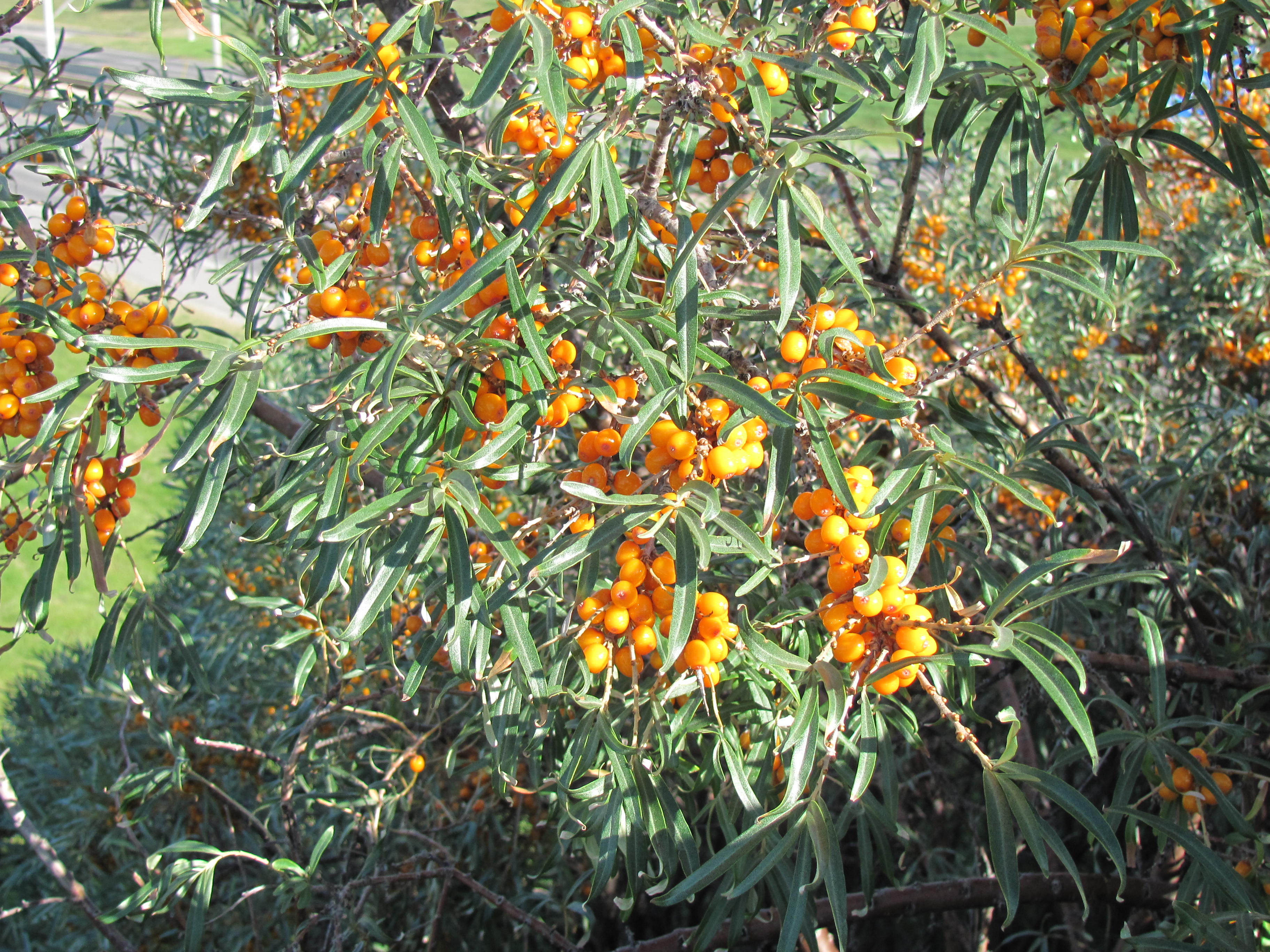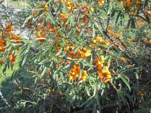 The sea buckthorn shrubs in my neighbourhood are heavy-limbed with bright orange, sweet-scented berries right now.  The harvest looks more abundant than I’ve ever seen before – it must be partly due to the higher-than-usual rainfall we’ve had this summer.   Sea buckthorn (Hippophae rhamnoides) can tolerate a great deal of drought – that’s one of the reasons the City has used them in large-scale plantings – but regular, even moisture promotes better fruit production.
