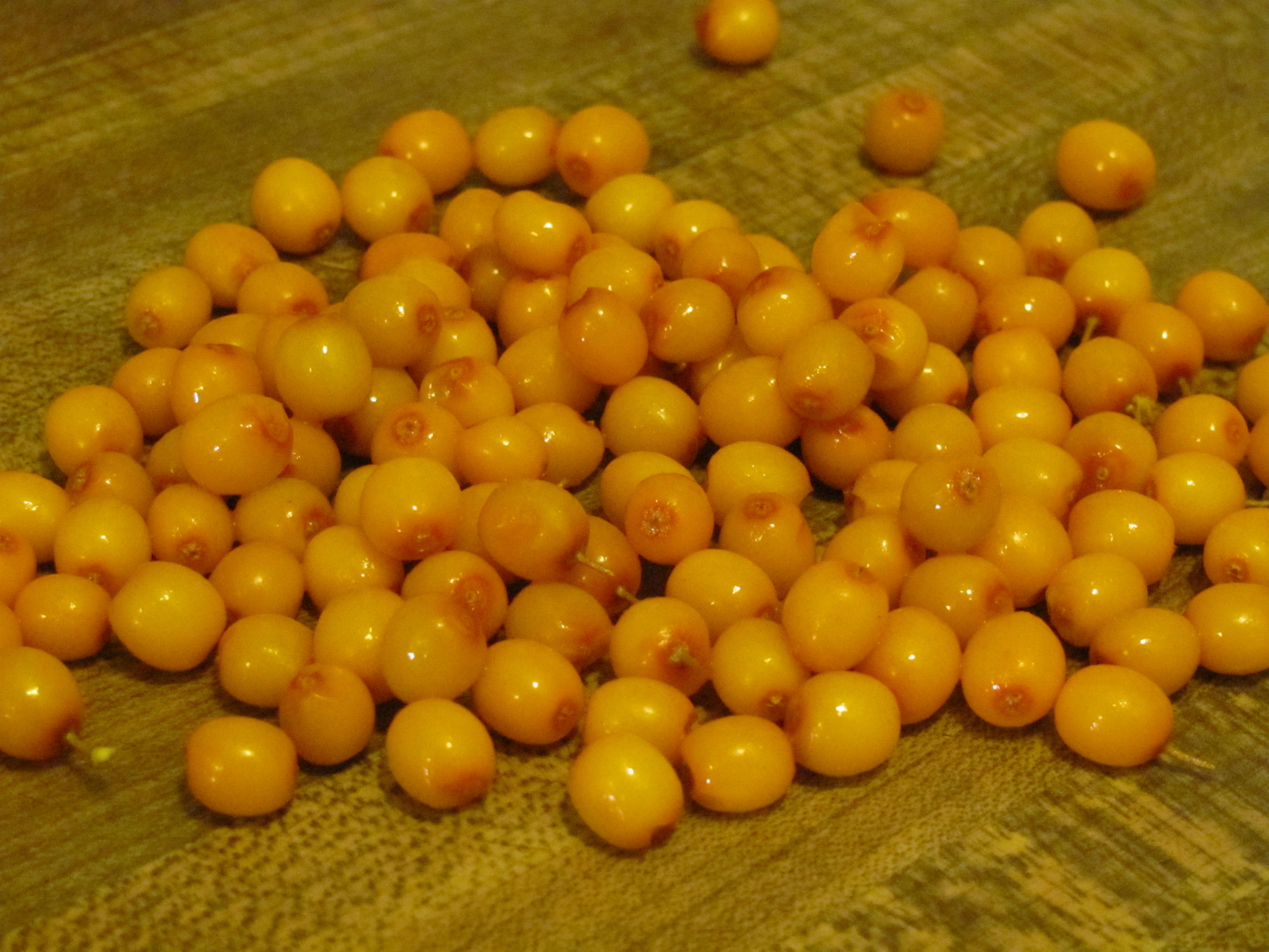 And there is the fruit!  It’s hard to believe just how nutritious these berries are – they’re filled with huge amounts of essential fatty acids and carotenes and TONS OF vitamin C.  I was a bit surprised at how difficult they are to harvest, though – a considerable amount of force is needed to remove them from their stems, and if you grip them too hard in the process, they burst open, spraying orange juice all over your hands.  (Apparently the “burst rate” in commercial harvesting is 15% or thereabouts, so I don’t have to blame my sloppy picking skills).   The berries are small and sort of slippery, and they hang in tight clusters right next to those vicious thorns (one of which found its way into my thumb this morning).  They are tart and citrusy when eaten fresh – most of the time, they’re found in processed products such as juice, beer and preserves.  At the moment, I have a pot of berries and water simmering on the stove, which I will eventually mix with sparkling water for what will be a refreshing cold beverage on this hot late-summer day.  And although I didn’t pick any leaves – they’re too mature at this time of year – they can also be consumed as a tisane.