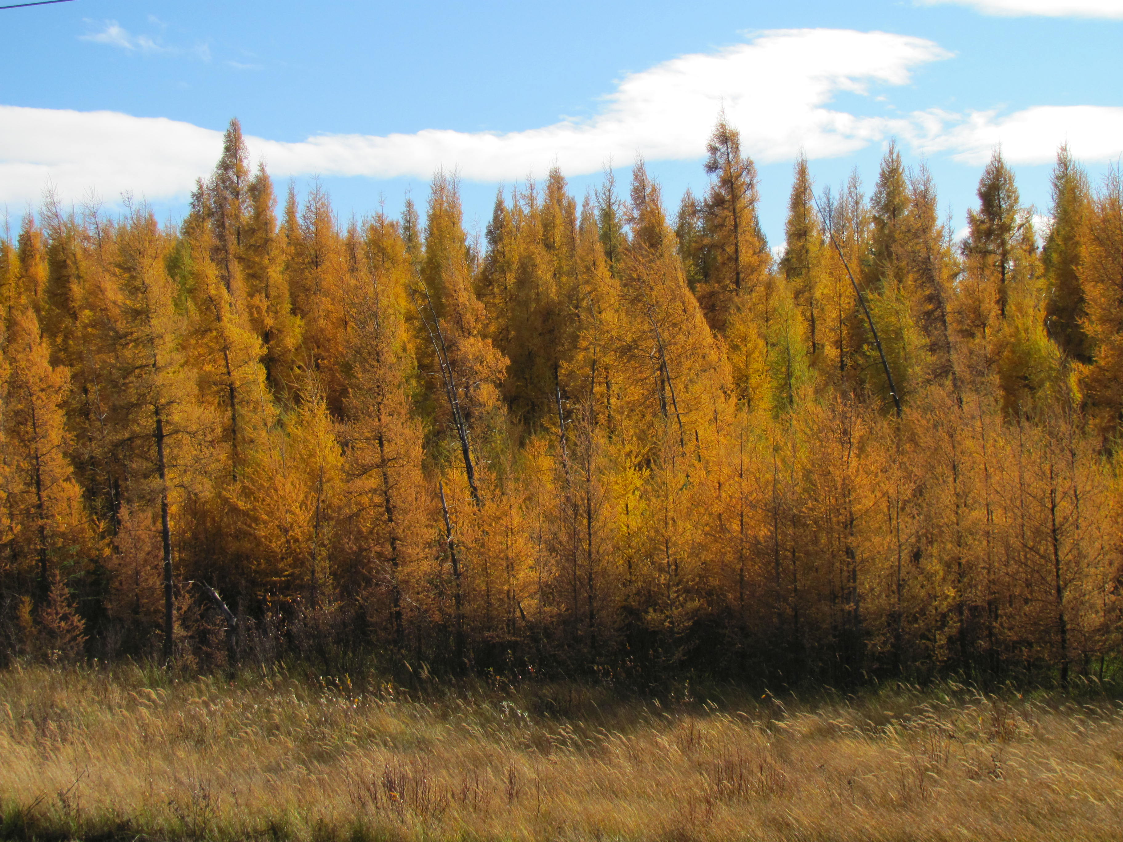 While celebrating the Thanksgiving holiday with family in northern Alberta this past weekend, I had a chance to take in the glorious sight of stands of my very favourite tree, all bedecked in autumn splendour. Larch trees aren’t commonly found in my neck of the woods, but for a few ornamental specimens in yards and in parks – it’s probably too dry out here for them to thrive. In the Peace Country, however, larch trees abound – and this time of year, they are particularly gorgeous. Most of the larch growing up north are tamarack larch (Larix laricina), although there are also planted stands of the non-native Siberian larch (Larix siberica), which is often used as a shelterbelt tree. Another Alberta larch is the alpine Larix lyallii, which is found in the southeastern portion of the Rocky Mountains. And…there are the highly architectural ornamental European larch, Larix decidua ‘Pendula’, with their deliberately dwarfed, weeping habit. (I’m not a fan of the shape, but weeping larch can definitely serve their purpose as dramatic specimen plants in a formal bed – they’re certain to capture attention. You can buy ‘Pendula’ in your local nursery). Larch are extremely slow-growing and long-lived trees that love getting their feet wet – much like willows, larch perform best in moist, well-drained soil. You’ll find tamarack larch in bogs in the far northern part of the province, or they may border wetlands and creeks.
