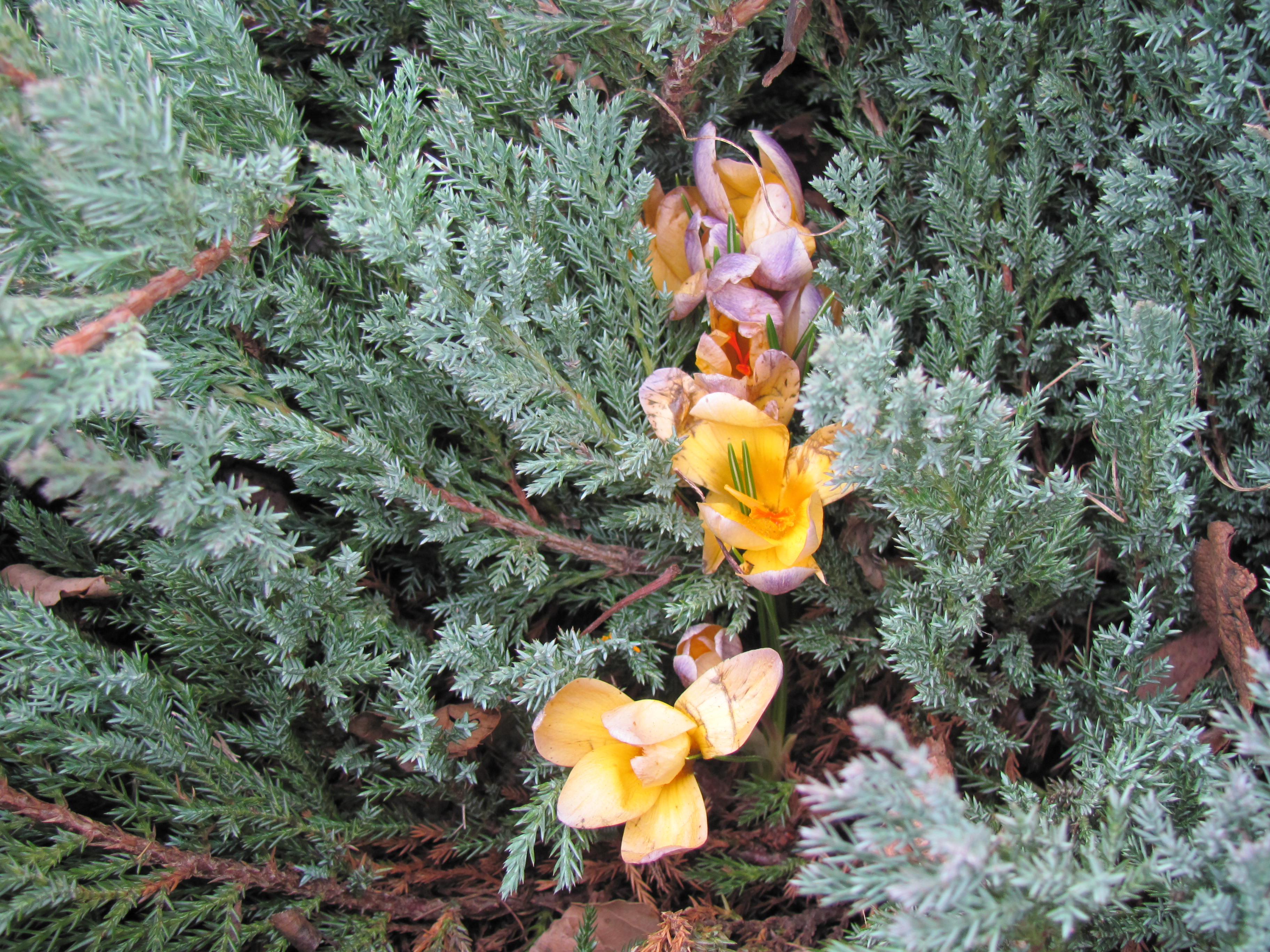 Ah, my crocuses have come and gone weeks ago now. We had such an early spring down here. (And virtually no winter at all.) I love that photo of the yellow crocuses among the juniper – great contrast! The first photo is amazing – such incredibly fuzzy stems and petals!