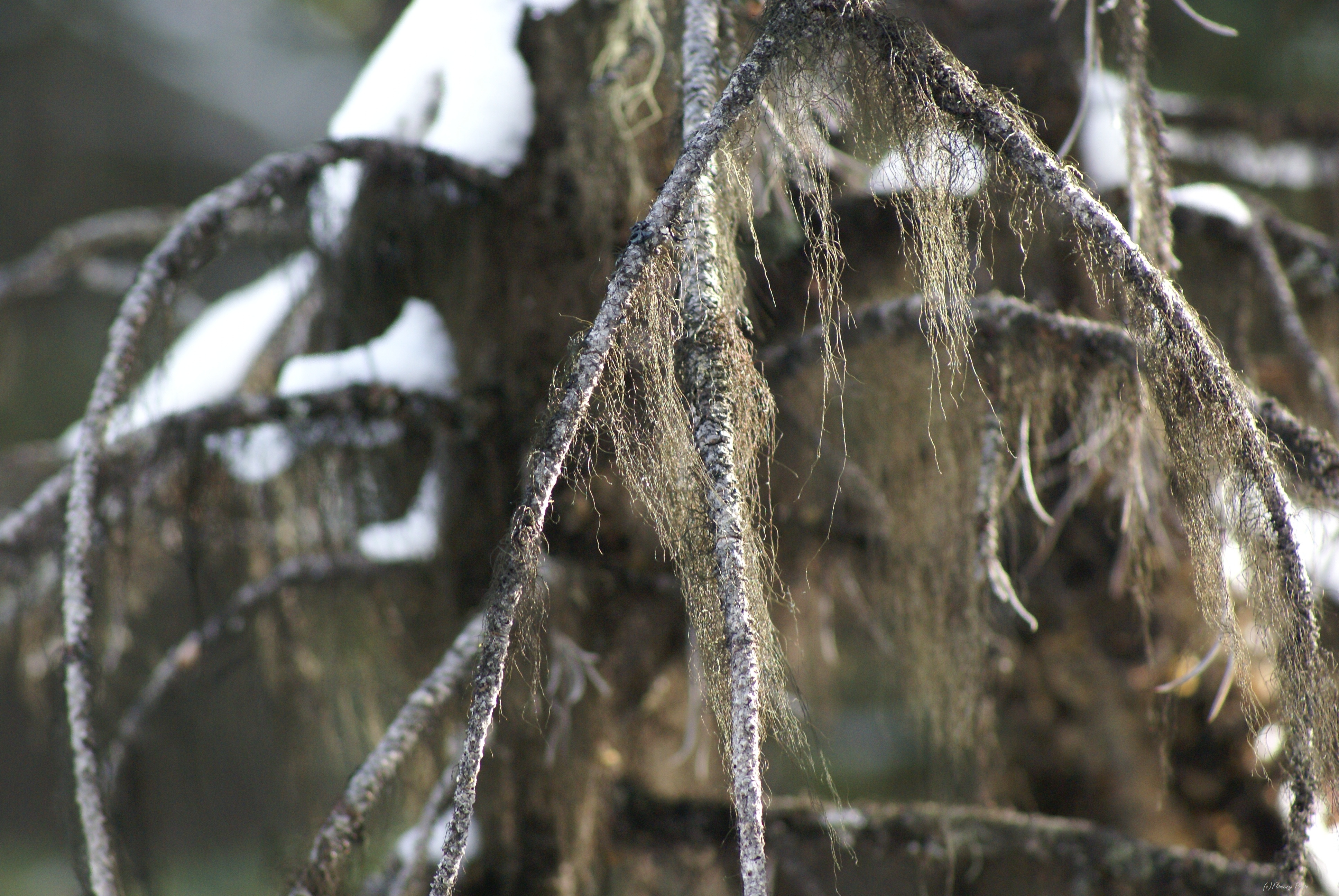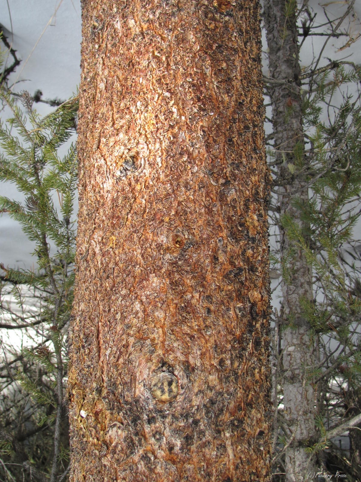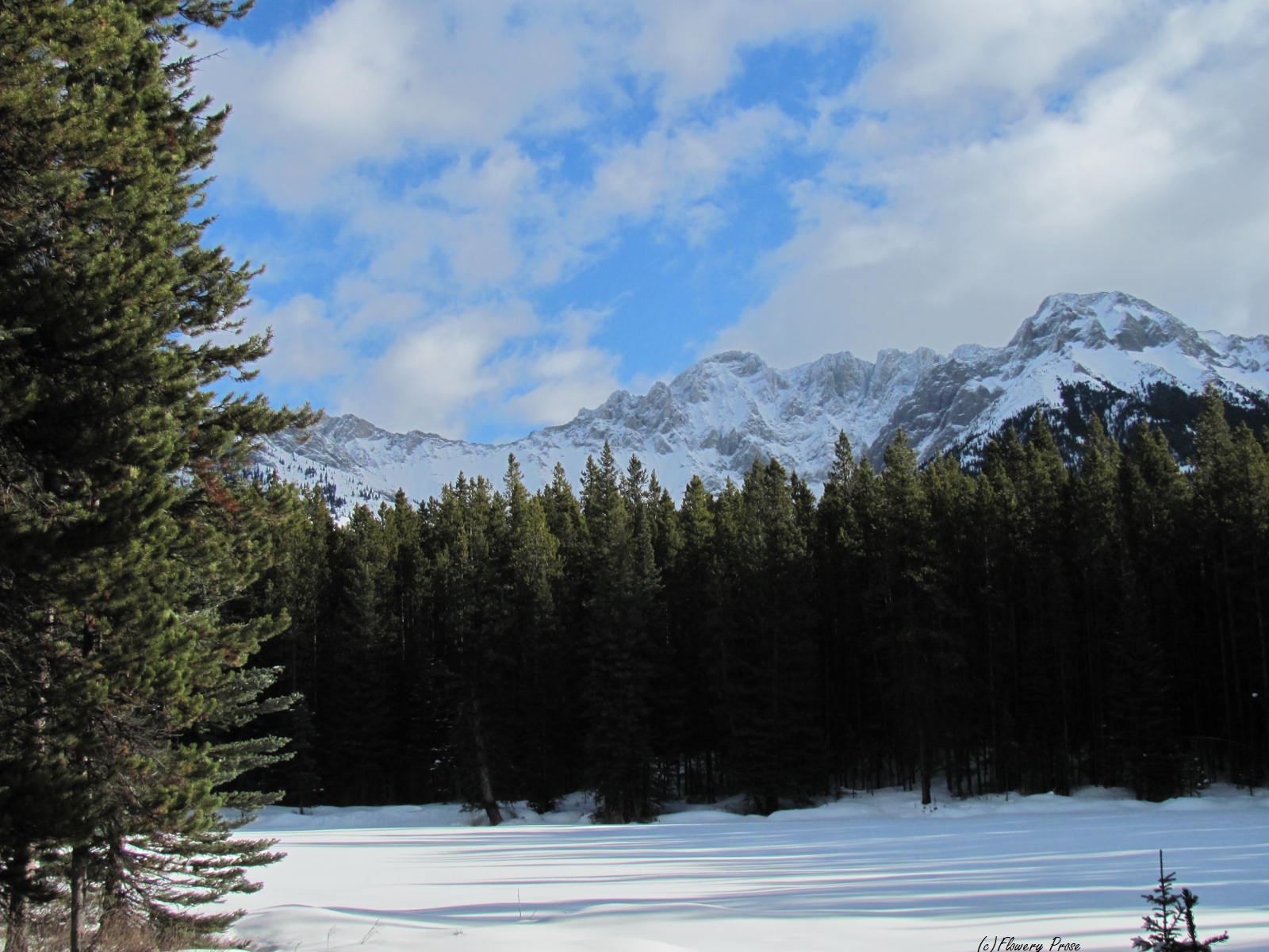 On Friday, my hubby and I made a day trip out to the mountains to enjoy the scenery and do a little snowshoeing. The Elkwood Trail in Kananaskis Country was our first destination (we later did a short trek near Lower Kananaskis Lake as well). This well-marked track runs through a large campground in Peter Lougheed Provincial Park, and encompasses an interpretive loop around Marl Lake. Stands of white spruce and lodgepole pine predominate, and we had to imagine what the trail will look like once the wildflowers awaken from their slumber. But, in the meantime, there were plenty of other interestingย sights to enjoy….