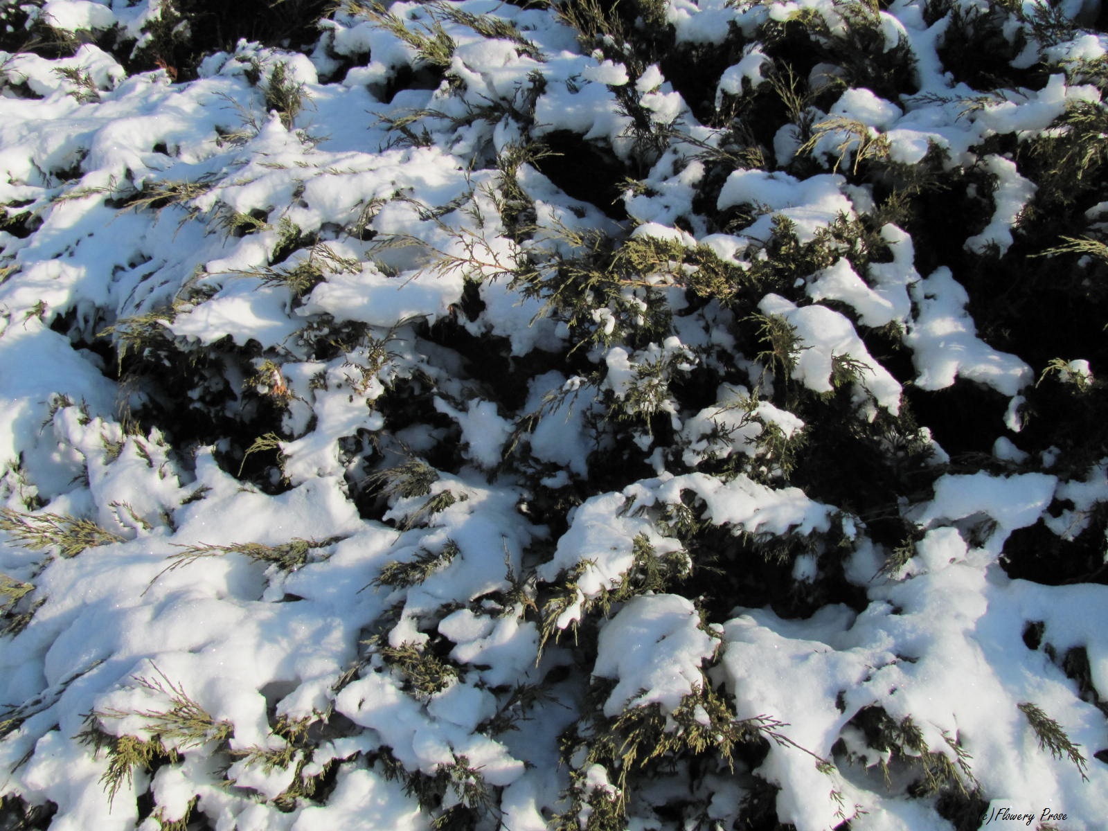 Plus, spreading junipers look great – or, at least, I think they do! Especially with a nice, fluffy layer of snow to decorate them. (Unfortunately, I can’t claim to have taken these photos a month or two ago – we received another sprinkling of the white stuff yesterday and I shot these images this morning. To my delight, warm winds moved in this afternoon and ate most of the new snow).