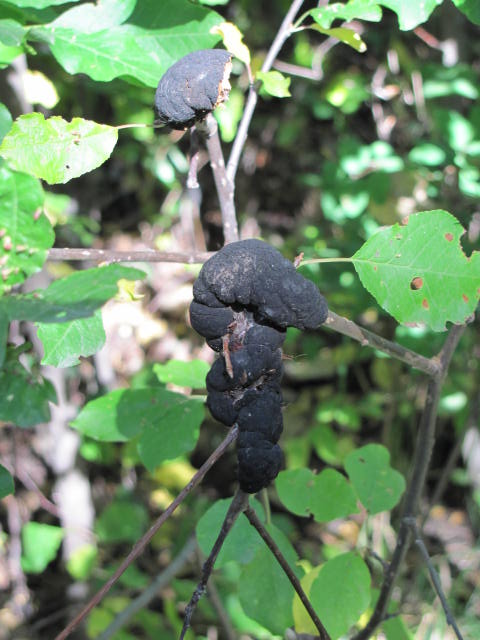 No, not really, but way back in September I had my first sighting of black knot fungus (Apiosporina morbosa) in a park in northwest Calgary. You can see why I was a bit alarmed! Black knot is a rather nasty affliction of plum, cherry, peach, and apricot trees, including the stand of maydays and chokecherries I was gawking at.