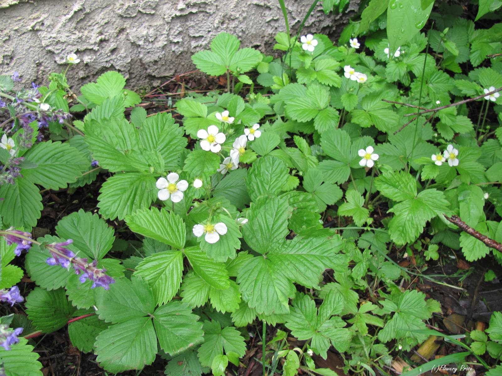 Way back in the summer ofย 2006, when I was still working in a garden centre, a grower brought me a flat of samples.ย I don’t recall what else was in the tray, but I know there was one alpine strawberry plant (Fragaria vesca ‘Alpine’) tucked in there with the rest.ย It came home with me and I planted it in a completely forgettable place behind a lilac.ย Over the yearsย the lilac has grown and theย little strawberry hideaway has gotten a bitย tangled with quackgrass (my excuse is that I can’t/won’t reach back there to pull it – I mean, thereย could be spiders or beetles or something on the lilacย and they might get in my hair)…