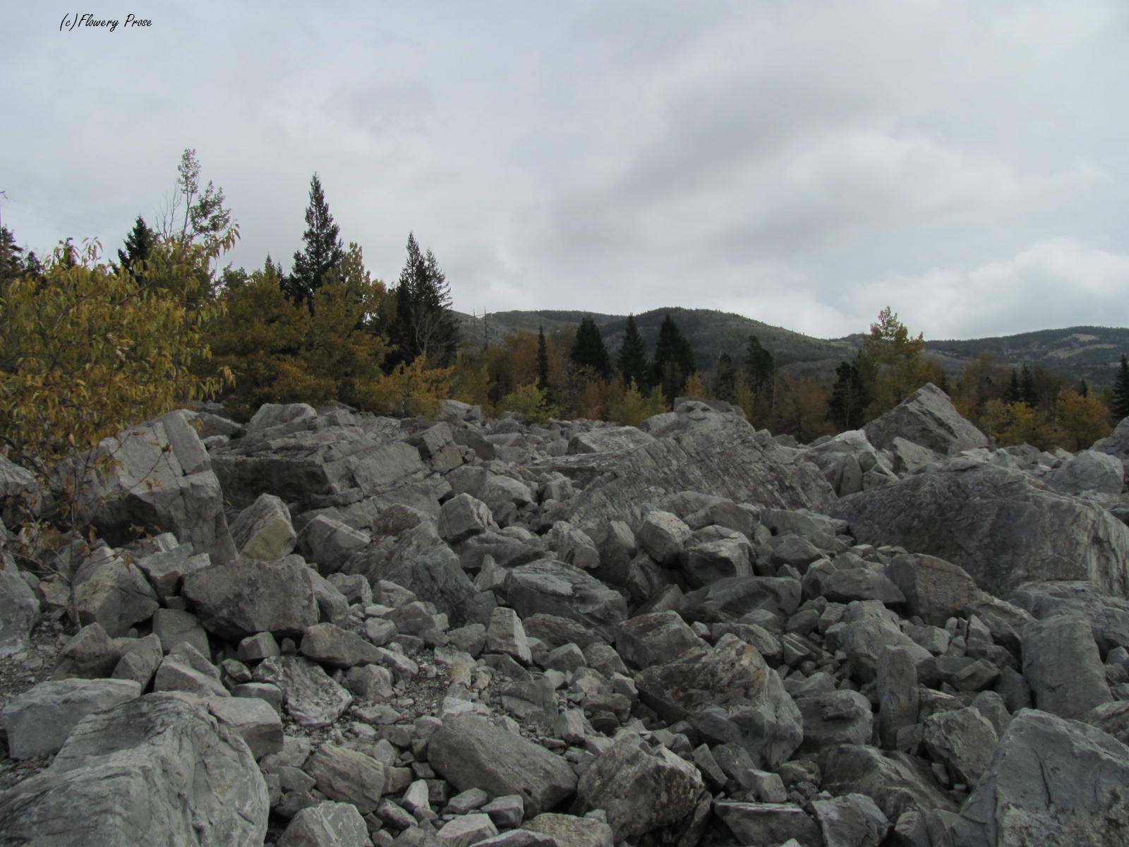 On our recent trip to the Crowsnest Pass, my hubby and I spent a couple of hours walking among the massive ruins of theย peak of Turtle Mountain, which slid over the east side of the town of Frank at 4:10 in the morning on April 29, 1903.ย  The slide lasted justย overย a minute and a half,ย andย at least seventy people were killed, buried under 82 million tonnes (90 million tons) ofย limestone.