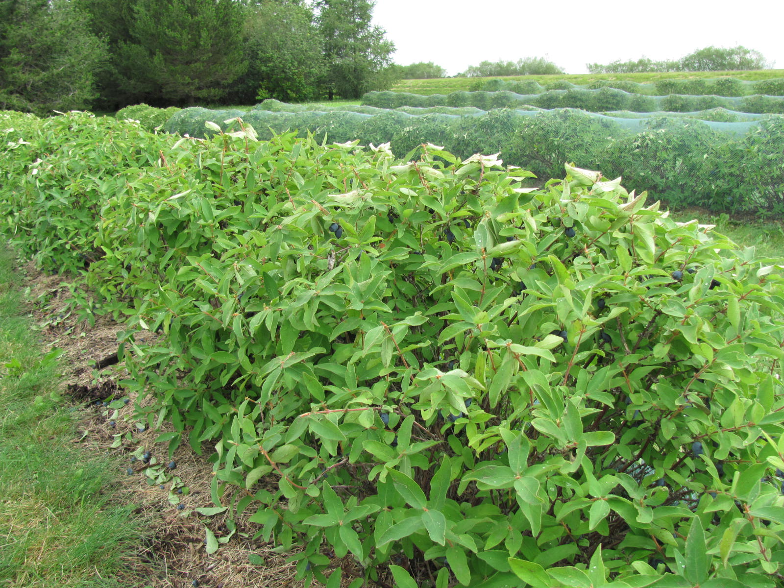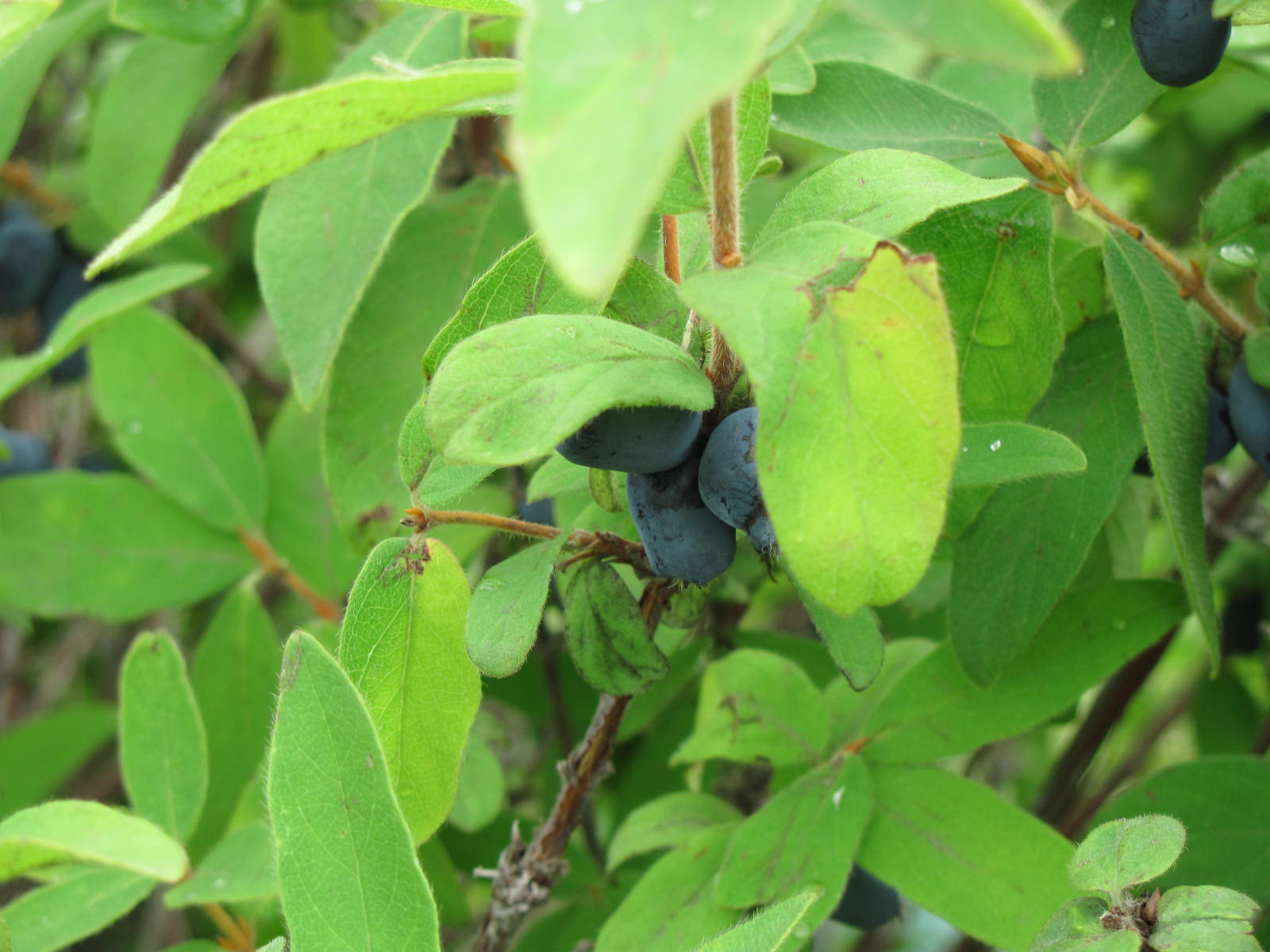 Another new venture was far more successful.ย In July, my hubby and I went out to a u-pick farm in Lacombe, nearly 200 kilometres northeast of Calgary.ย You have to go out early to pick what we were after:ย haskaps (also known as honeyberries, the edible fruit of certain speciesย ofย honeysuckle) get a bit mushy at high temperatures andย become nearly impossible to remove from the branches.ย The farm’s owners were scrambling to remove debris from a huge hailstorm the night before andย setting upย several carloads of people in an adjacent field, where they were picking buckets of huge red strawberries.ย We were the only ones out with the haskaps, and after weย helped one of the owners pull the bird netting off of a row of the shrubs, I got to work.ย This was my first time picking haskaps, but I was prepared for their soft texture:ย you don’tย yank them offย and throw them in buckets as you would with most berries.ย They have to be finessed in such a way with gloved fingers (it’s very important to wear the gloves) so that you don’t squish them and then you lay them gently in flat boxes, being careful not to pile too many on top of each other.ย While there are haskapย cultivarsย with berries thatย are less soft than others, I found that in theย building heat, they pretty much juiced themselves even with my careful preparation.ย I picked almost six pounds of the beauties and most of them were turned into the most incredible jam I’ve ever tasted.ย They have a flavour reminiscent of the best blueberries you’ve ever eaten, but tangier.ย And waaaaaaaay better.