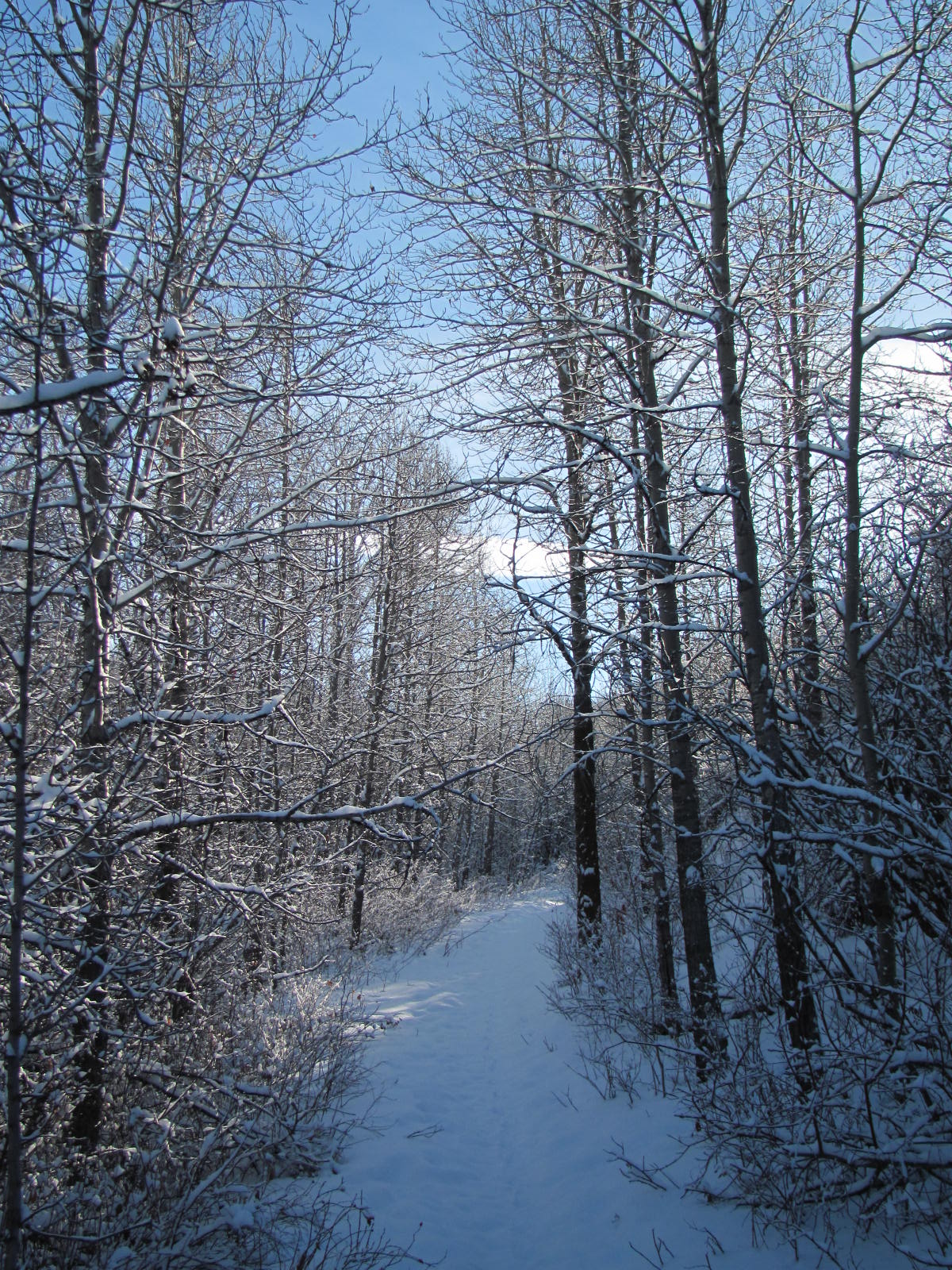 While procrastinating taking a break on New Year’s Day, my hubby and I headed out to Paskapoo Slopes for a walk. We really ought to have brought our snowshoes for the outing, as the snow was fresh and powdery and downright perfect. We followed coyote tracks in the wooded areas, and even heard the yips of one somewhere out on the west ridge, near the ski hill. It was one of those bright blue sky-vitamin D days, and once again I wondered why we humans don’t come with a built-in solar panel to trap and conserve sunshine for later use.