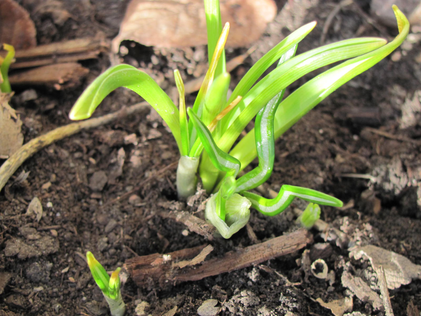 I know Iย shouldn’t get so excited…but it’s been awhile since I’ve seen anything that colour coming out of the ground.ย  (It’s interesting that they already look a tad ragged – the fact that I neglected to fertilize them last fall and a good number of hungry cohabitating rabbits may be to blame).