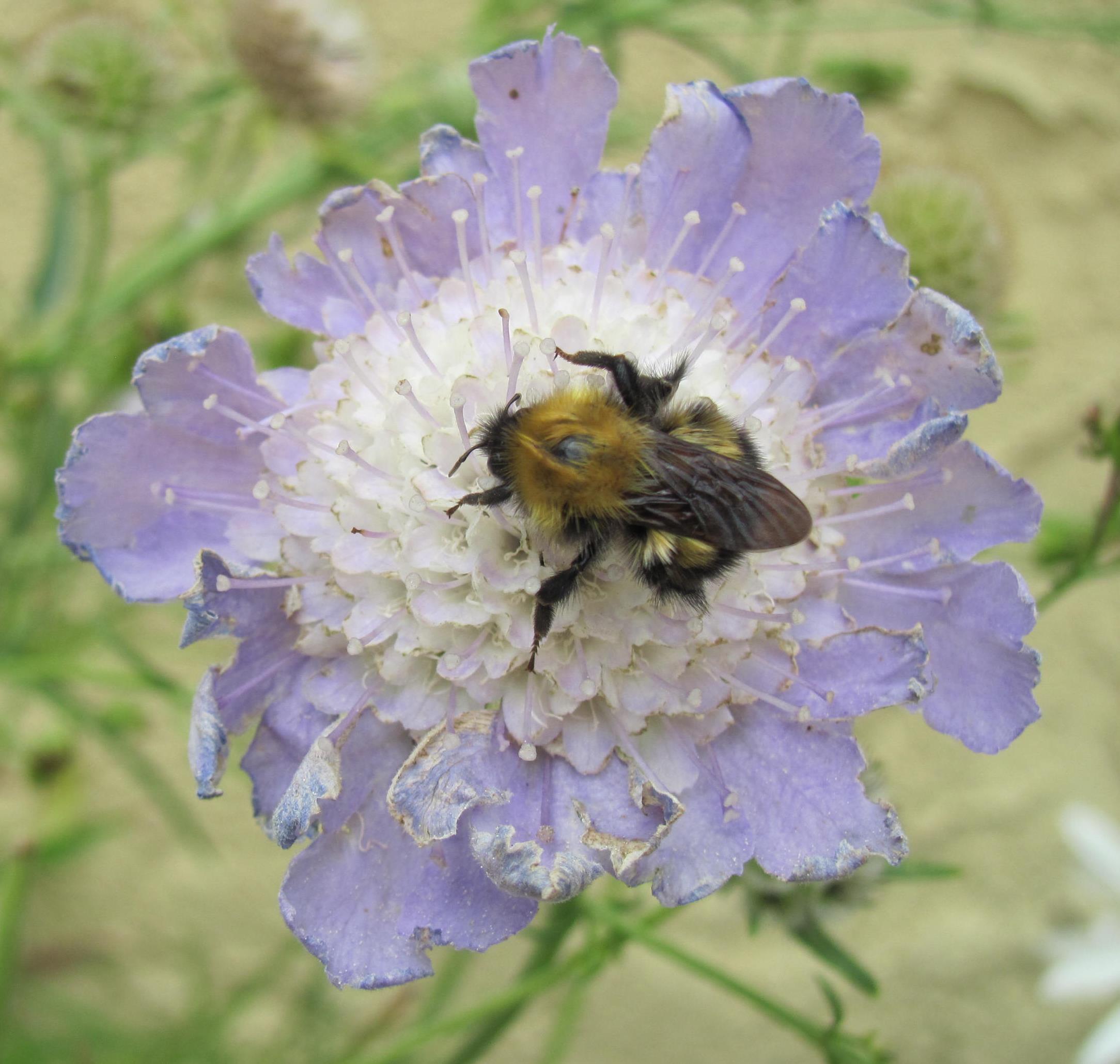 I meant to post this photo ages ago…I’m hoping to pick the brains of anyone who is interested in/an expert regarding/wants to wildly speculate aboutย bees to get an ID for this littleย one I found on a fading scabiosa bloom in my garden.ย I took this image on a chilly morning in late August and the bee seemed awfully cold –ย it sure wasn’t moving much.