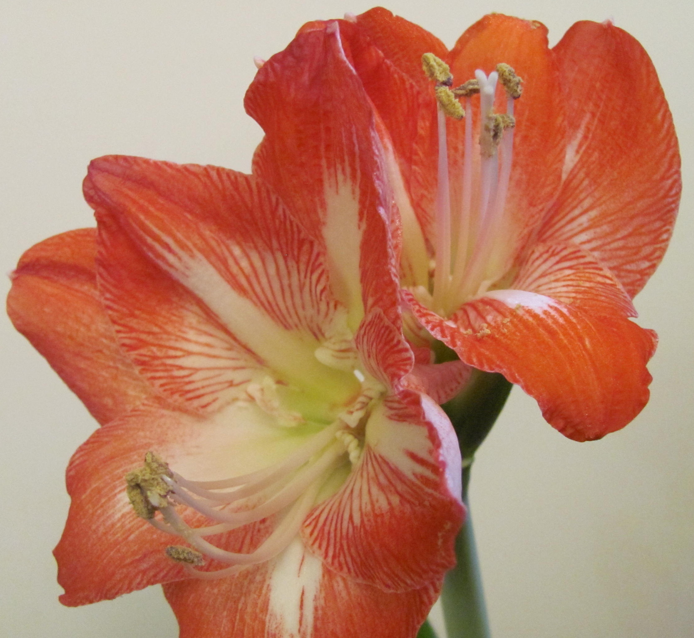 UPDATED JANUARY 6, 2015 – as Chloris has pointed out in the comments below, itย seems that my amaryllis is not actually a ‘Red Lion’ cultivar as I was led to believe by the seller.ย That would definitely explain my confusion as to the colour of the blooms!ย But…I don’t know which coral-striped type this is, so if anyone has any ideas, please feel free to chime in!