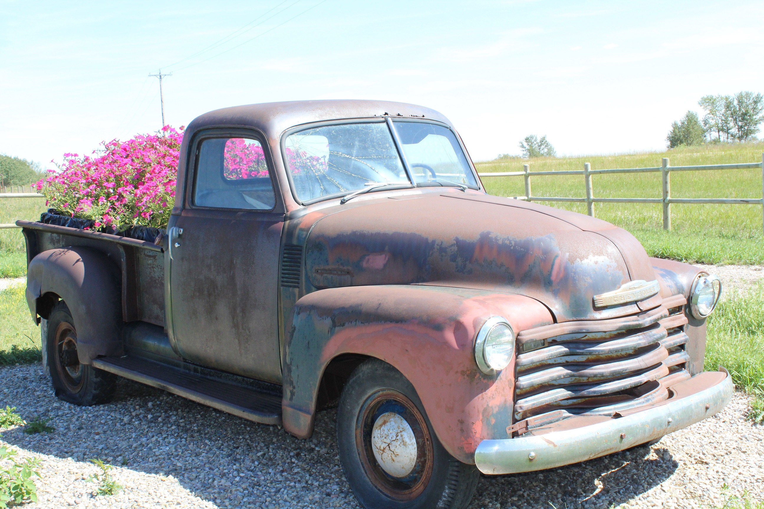 A Flowery Friday and an Alberta Snapshot rolled into one…if you head east of Calgary to the hamlet of Carseland, you’ll easily spot this eye-catching, petunia-festooned unrestored 1949 Chevy pickup in Downey Centennial Park, just off highway 24. The truck was donated by longtime residents and in its past life, regularly transported two adults and five kids on trips off the farm.