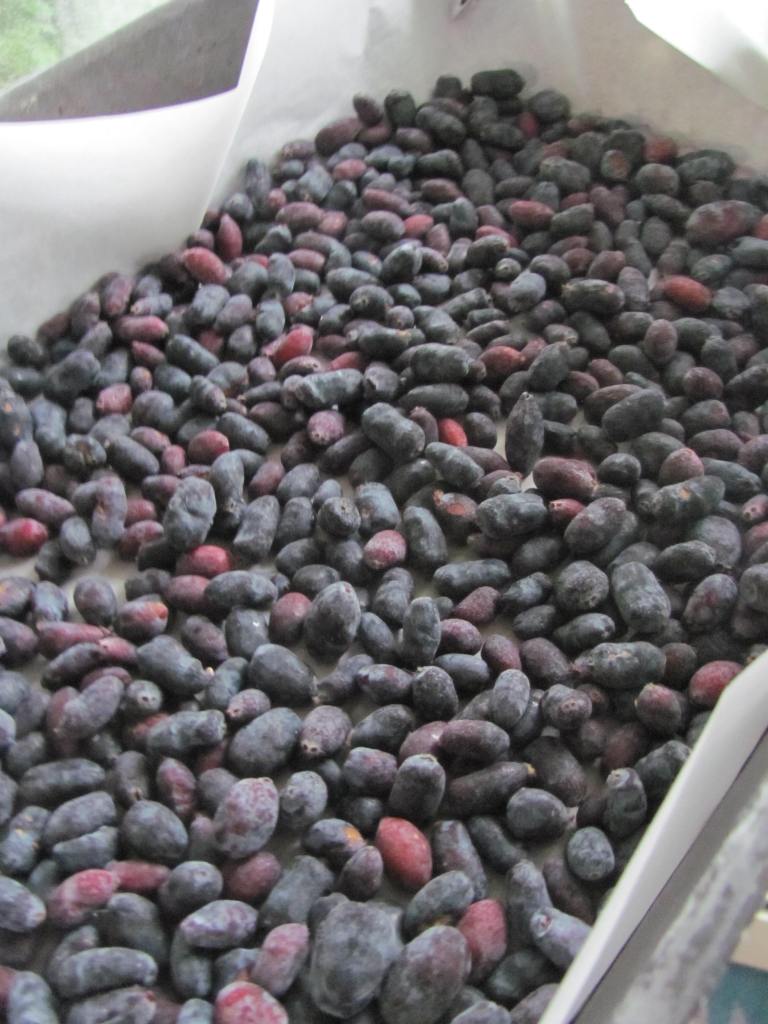 If you’re looking to freeze berries without sugar and don’t want them to clump up in storage, try this method. Get a large baking sheet and line it with a piece of baking parchment. Wash the berries well and pick out any stems and other debris (including insects!). ๐Ÿ˜‰ Spread the berries in a single layer on the baking sheet and pop the sheet, uncovered, into a large freezer for at least six hours. Remove the baking sheet and immediately pack the berries into storage bags. Label the bags and put them back into the freezer until use. The berries freeze individually, which makes them easier to work with and measure out when you want to use them in baking and cooking. This method works supremely well for fruits such as blueberries, raspberries, currants, saskatoons, and haskap (pictured – this was part of a haul I picked on a very cold, damp day a few weeks ago on a farm outside of Calgary. I was shivering so much a few not-quite-ripe ones snuck in, LOL).
