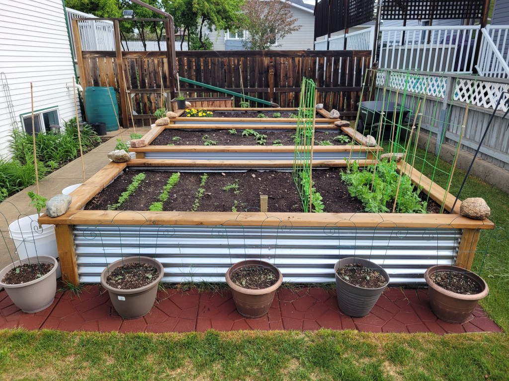Although I have had small, raised beds planted with different varieties of tomatoes in years past, the summer of 2021 was the first with our three large 4′ x 8′ x 2′ raised beds a friend made. They are made from galvanized metal and should last a lifetime. Last year I had potatoes, carrots, peppers, cucumbers, and tomatoes planted in the beds. This year we have expanded with four smaller raised beds. I currently have peas, carrots, potatoes, and marigolds planted in the large beds. I have several containers planted with zucchinis, peppers, tomatoes (in 5 gallon pails), and cucumbers. My smaller 4 x 4 raised beds have onions, lettuce, radishes, beets, spinach, and turnips growing well. I have learned that it doesn’t take a ¼ section of land to have a huge garden like in my Gramma’s time. All you need is a container with drainage, be it a 5 gallon pail or raised bed; good quality soil; rain; and a little sunshine – you can grow almost anything.