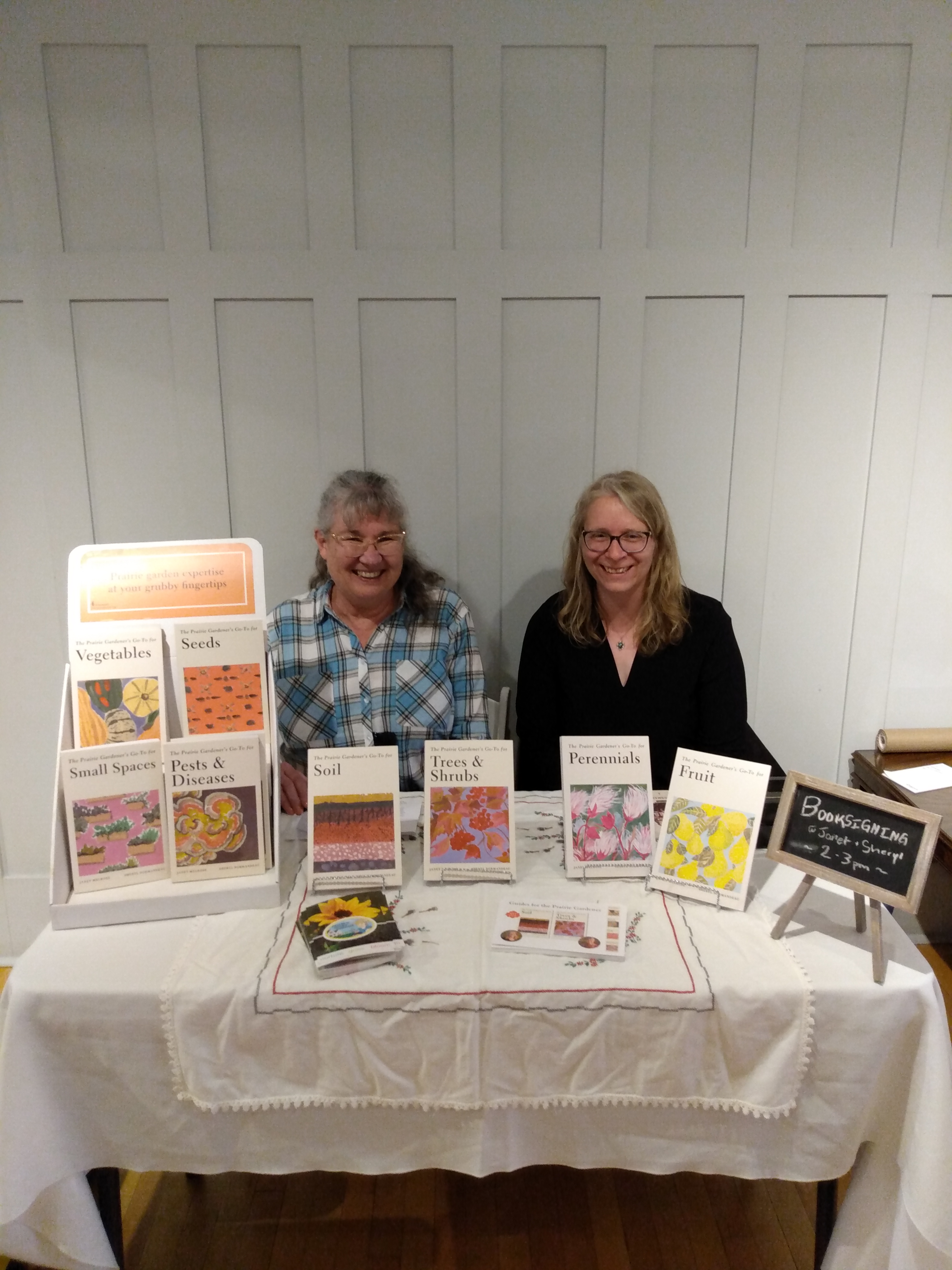 Sunday April 16…Janet and I were out and about again, this time in Calgary at the beautiful historic Lougheed House. It was an exceptionally warm, sunny day and Janet gave a talk and demo outside on the grounds about small space gardening (a couple of bees and a ladybug even joined the guests in attendance!). Afterwards, we all went inside the house for a book signing. We had a lovely time in an incredible space and enjoyed visiting with everyone who attended. (And a special note: the small tablecloth on our table is one of the artifacts from the house. Such a wonderful touch!).