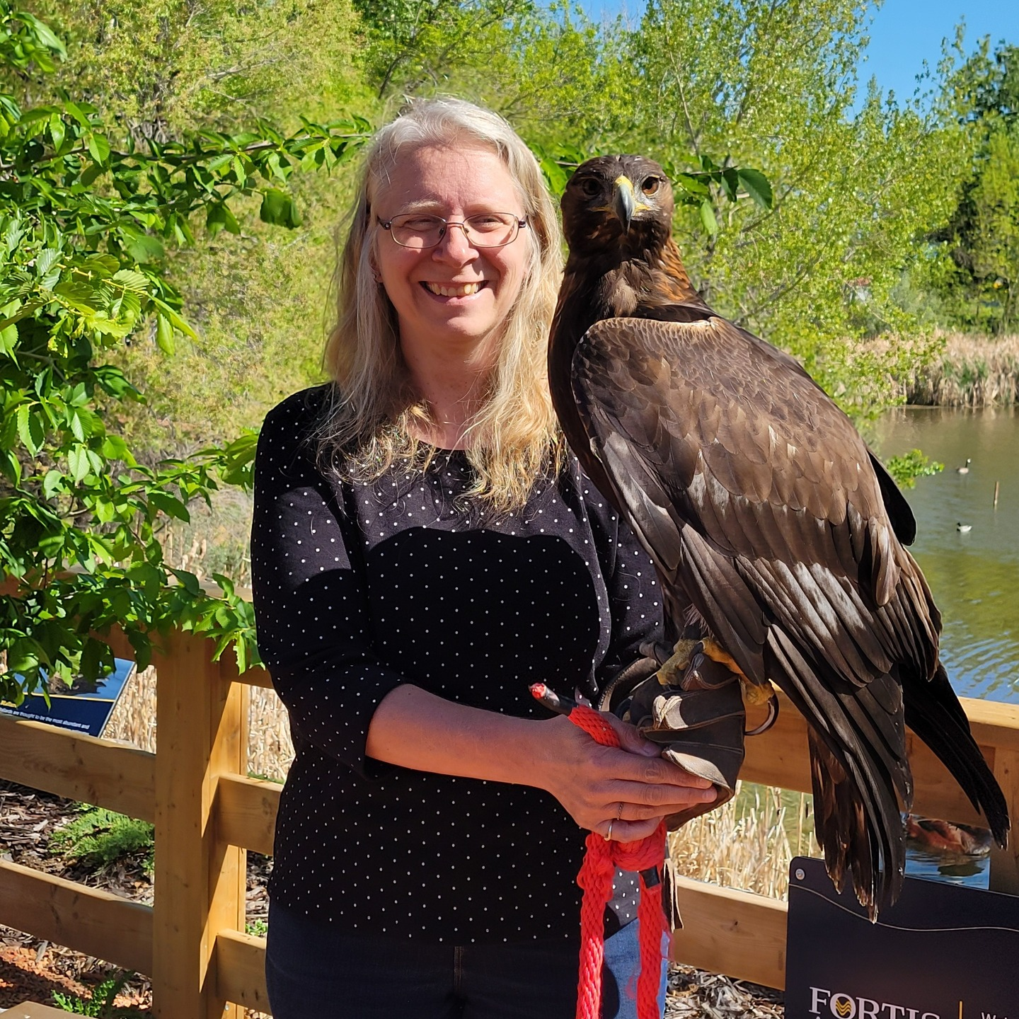 In May, my husband and I took a drive out to Coaldale to tour the absolutely incredible Alberta Birds of Prey Centre. We had booked a couple of special bird encounters on top of our general admission, which gained us exclusive access to some behind-the-scenes extras that we will remember forever. One of them was to interact with and hold the magnificent golden eagle Sarah, seen here on my arm. This beauty is 42 years old – can you believe it? We also held a Northern saw-whet owl, a burrowing owl, a barn owl, a great horned owl, and a kestrel – and we fed a six-week-old baby great horned owl that sort of looked like the inside of a duvet with monstrous taloned feet and a beak that never stopped moving. Adorable! We also spent hours touring the site and enjoying all of the other birds in the aviaries and in the ponds, plus there was a spectacular flying demonstration with a bald eagle named Grace. A massive thank you to the staff at the centre and especially to Colin and Cheyenne for making our excursion so special!