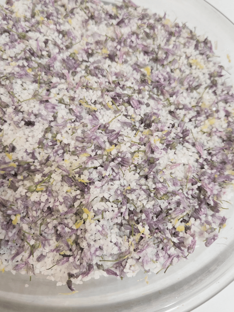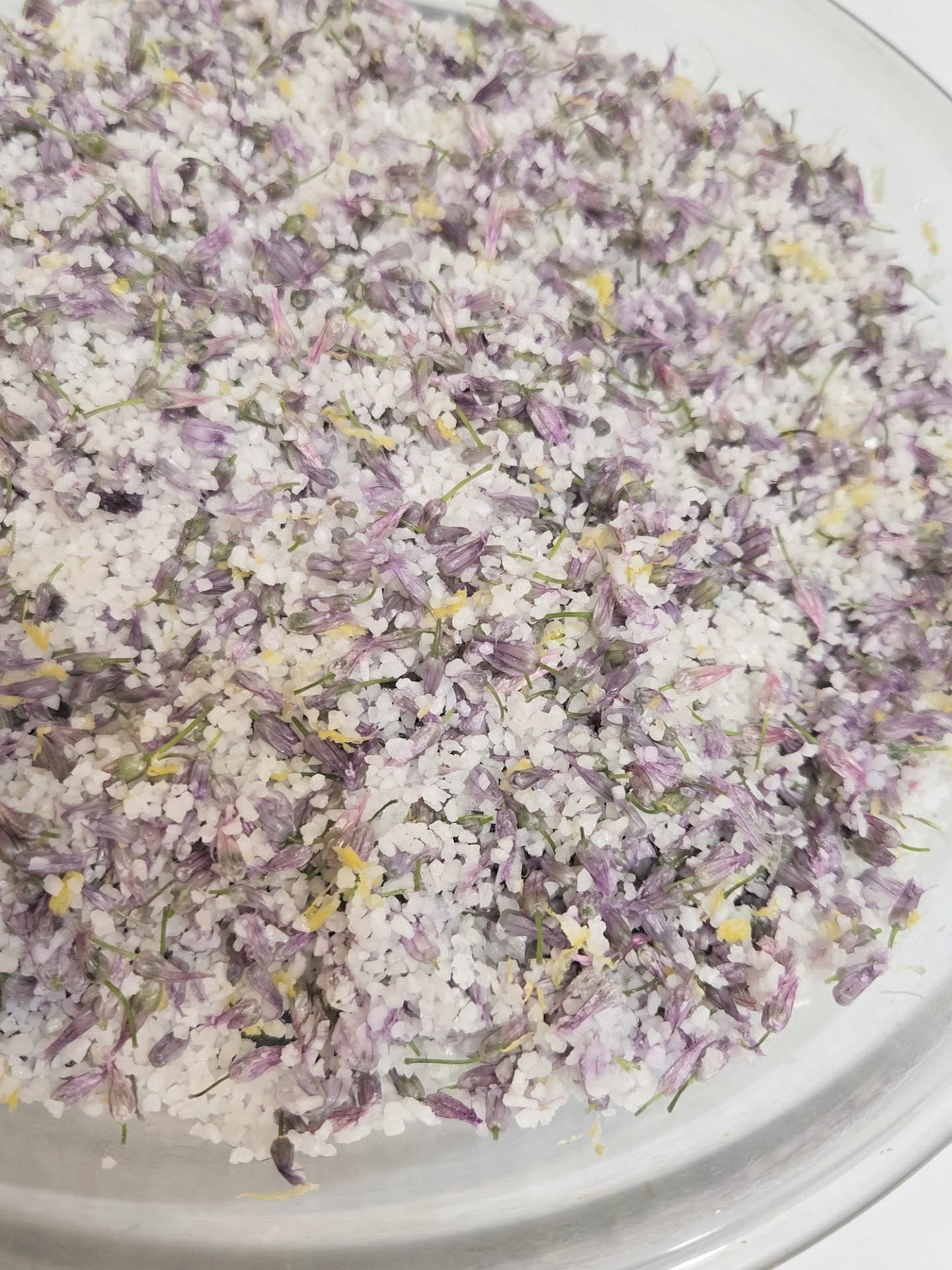If you still have some chive blossoms kicking around, there are plenty of ways to use them in cooking. Here’s one: make a finishing salt by drying torn fresh chive blossoms, the zest of one organic lemon, and coarse sea salt. Dry the mixture really well. (When you think it might be dry, dry it some more.) Store it in a glass canning jar with a good lid and sprinkle it on everything you can think of. (Well, the things that make sense for you to salt, that is…).