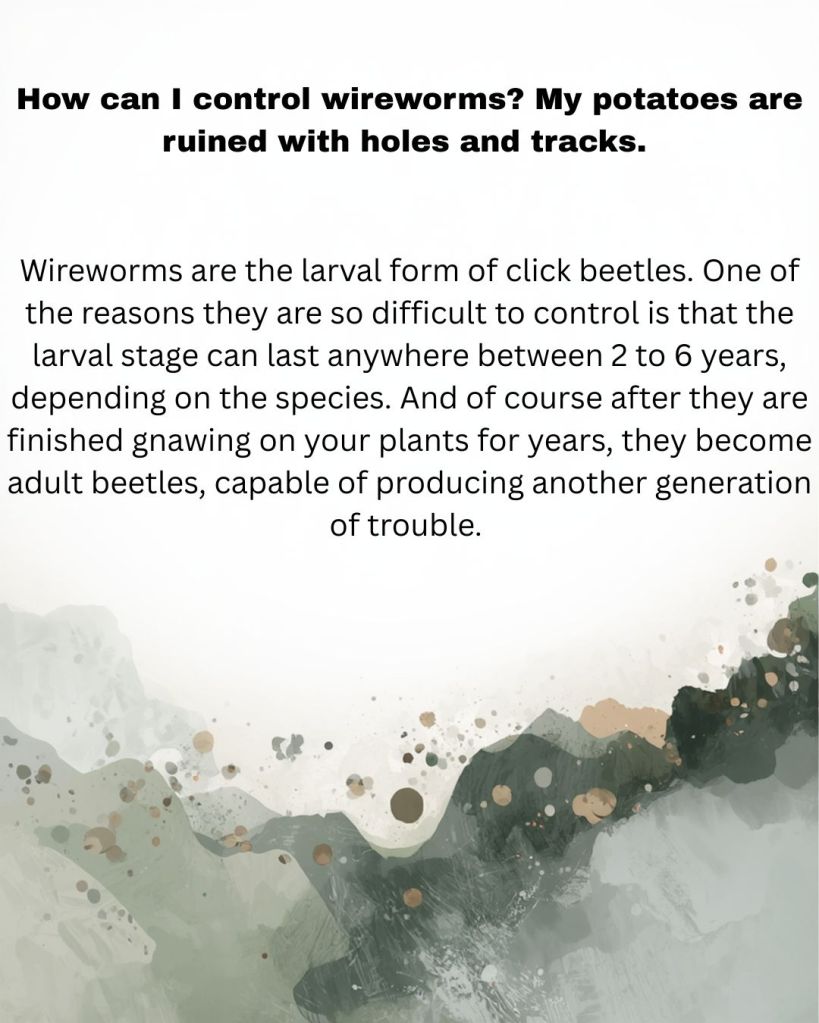 Wireworms LOVE turfgrass, and you’ll most often find them in lawns. If given the opportunity, however, they will seek yummier grub and make a mess of your potatoes and carrots – particularly if your vegetable garden is nestled up against a patch of grass or if your veggie garden was converted from a former lawn.